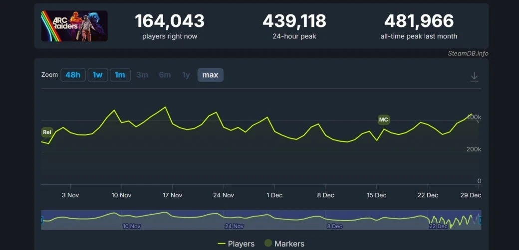 При этом самый низкий показатель суточного онлайна ARC Raiders в Steam после 16 ноября превысил 263 тысячи игроков. Таким образом extraction-шутер не смог растерять и половины от своих пиковых показателей на платформе Valve. Это особенно интересно на фоне того, что большинство онлайн-игр показывают падение онлайна спустя несколько недель после релиза.