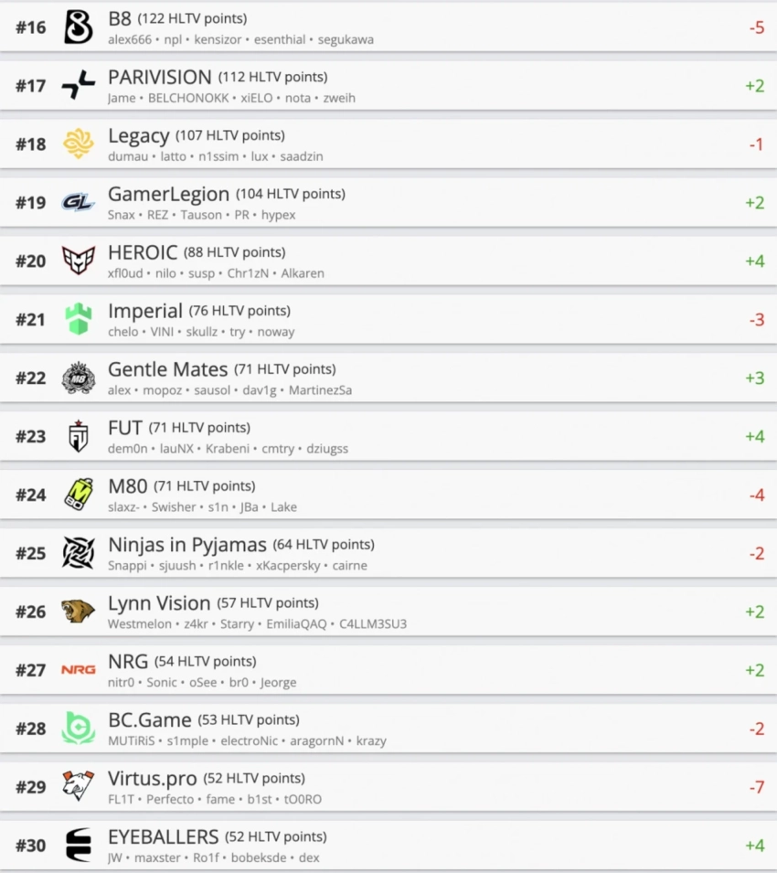 Главным неудачником обновления стала команда B8 Esports. Коллектив потерял сразу 5 позиций и рухнул с 11-го на 16-е место. Также отрицательную динамику показали Virtus.pro и ряд бразильских команд (paiN, Legacy, Imperial).