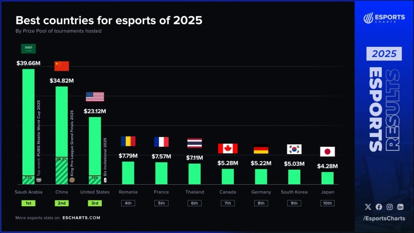 Саудовская Аравия обошла Китай и США по сумме призовых в киберспорте за 2025 год