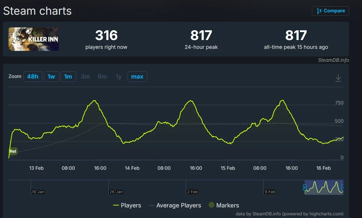 Согласно SteamDB, пиковый онлайн Killer Inn вчера достиг 817 человек. На момент написания новости в игре находятся 316 человек одновременно.