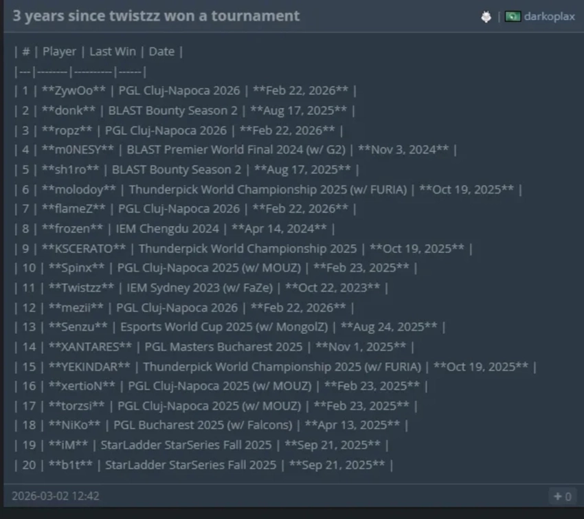 Трифунович отметил, что если взглянуть на текущую форму киберспортсменов под таким углом, вырисовывается крайне любопытная картина трофейной засухи: Так, именитый канадец Рассел «Twistzz» Ван Далкен расположился на 11-й строчке этого рейтинга. Свой последний кубок он завоевал еще в составе FaZe Clan на турнире IEM Sydney 2023, финал которого прошел 22 октября 2023 года.