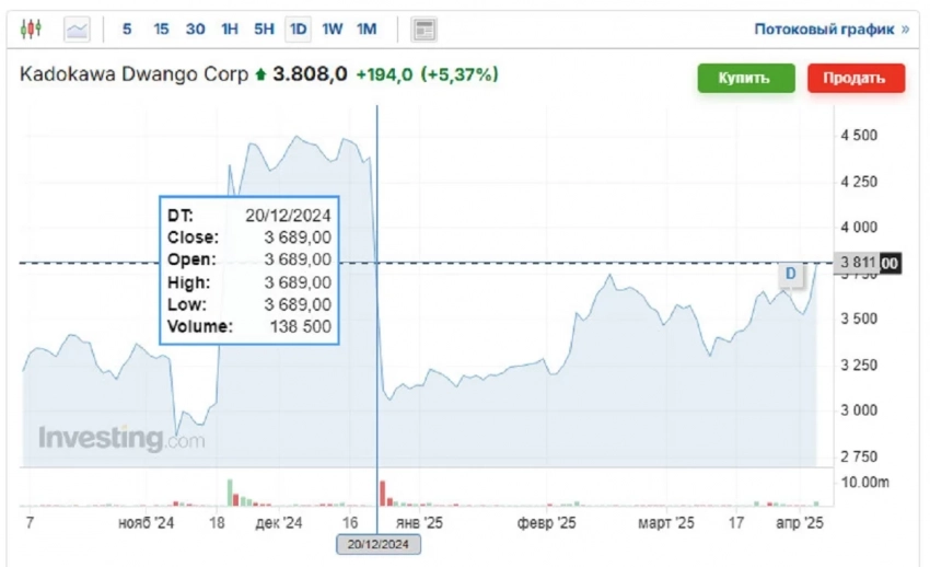 В момент написания новости одна ценная бумага Kadokawa торгуется за 3.808 японских йены — рост превысил 5% за сутки. Аналитики прогнозируют дальнейший рост и рекомендуют покупать акции компании. К слову, текущая цена самая высокая за более чем 3 месяца торгов. В последний раз акции стоили дороже только в декабре.