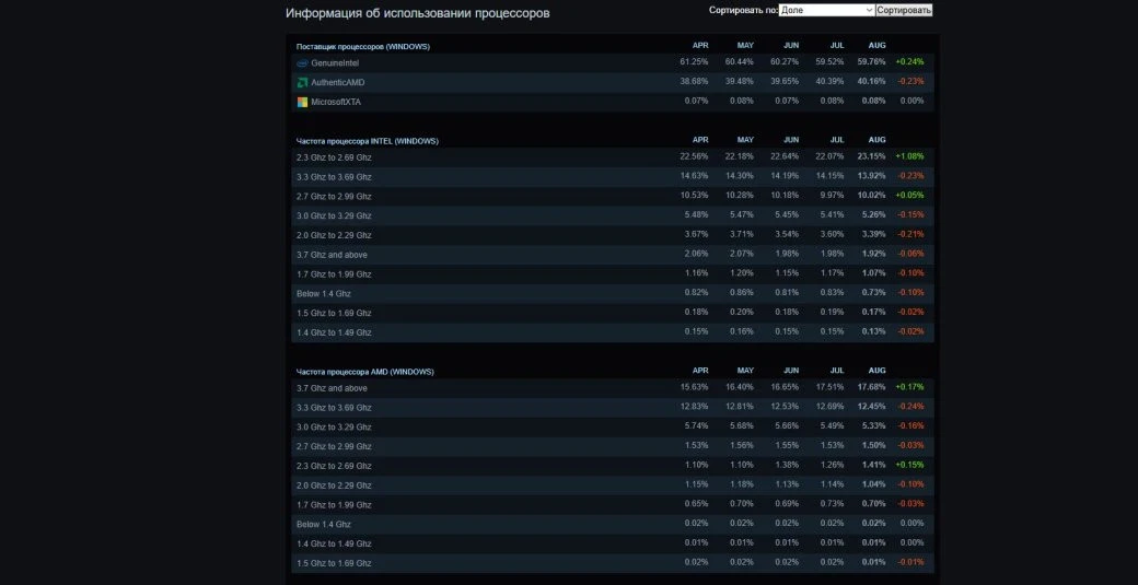 Наибольшей популярностью до сих пор пользуются процессоры Intel — они стоят на 59,76% систем игроков в Steam, причём за август прибавка составила 0,24%. На протяжении прошлых месяцев AMD пыталась догнать конкурента, но в июле доля процессоров компании снизилась на 0,23% — до 40,16%.