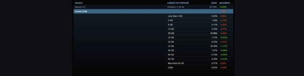 2 фото16 ГБ оперативной памяти — классика, которой может похвастаться 41,88% пользователей Steam. Однако в августе число игроков с этим объёмом памяти уменьшилось, тогда как варианты систем с 24 ГБ (+0,03%), 32 ГБ (+1,31%), 48 ГБ (+0,06%), 60 ГБ (+0,05%:) и 64 ГБ (+0,03%) стали слегка популярнее. Все объёмы оперативной памяти менее 24 ГБ показывают небольшое снижение.
